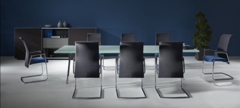 Kolekcje String uzupełniają krzesła konferencyjne na nogach i płozach, które dzięki zastosowaniu doskonale wyprofilowanego oparci membranowego zapewnia komfort siedzenie podczas długich narad i spotkań biznesowych.